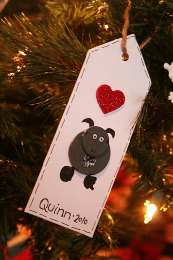 Lastly, the most important part…the darling ornament that they made. Quinn painted the goat…helped me glue it all on…and used his finger prints to make the feet! Now he hangs proudly on our tree! I hope we give a whole farm by the time these boys are big! :)