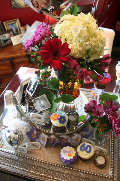 The table was fun to decorate. The grapevine balls had lots of fun pictures from the years past…and the little ceramic placecards have words that Quinn said described his Mammer! Sweetness…